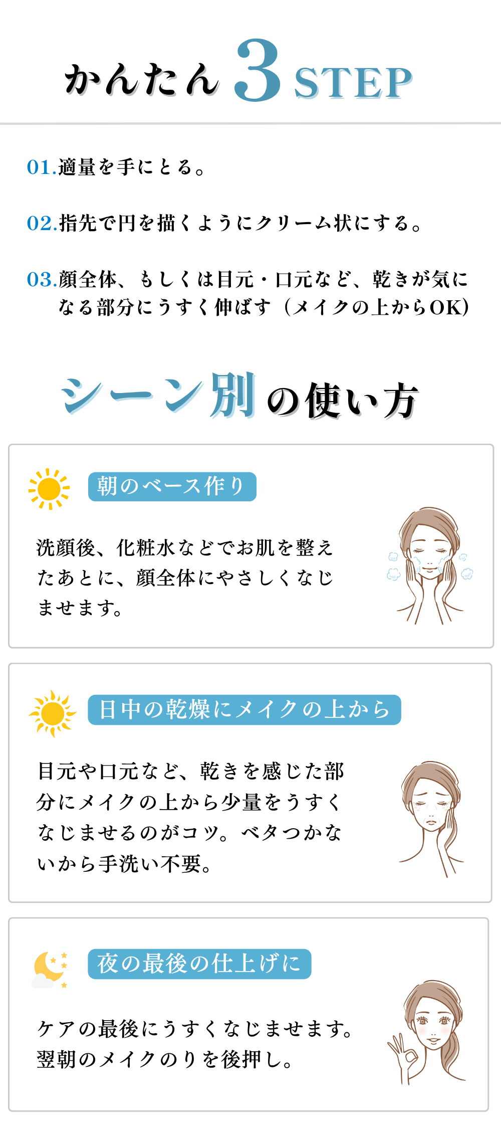 ■使い方:1,洗顔後、化粧水で肌を整えます。 2,適量のパウダークリームを手に取り、顔全体にやさしくなじませます。 ※日中はお化粧直しとして、メイクの上からもうるおいを補えます*1。